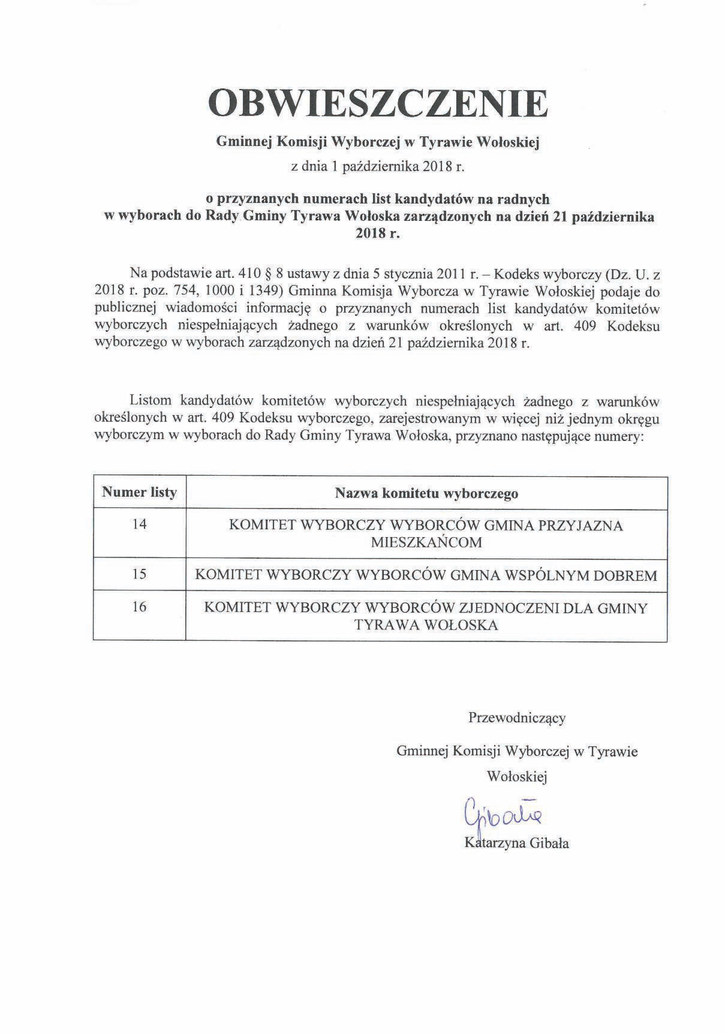 1. Gminna Komisja Wyborcza w Tyrawie Wołoskiej  na podstawie art. 410 § 7 ustawy z dnia 5 stycznia 2011 r. Kodeks wyborczy przyznaje , numery listom kandydatów tych komitetów wyborczych, którym nie został przyznany numer przez Państwową Komisję Wyborczą ani przez komisarza wyborczego. Numery te Gminna Komisja Wyborcza w Tyrawie Wołoskiej  przyznaje, w drodze losowania najpierw listom kandydatów tych komitetów wyborczych, które zarejestrowały kandydatów w więcej niż jednym okręgu wyborczym spośród numerów po numerach przyznanych przez komisarza wyborczego, a następnie listom kandydatów komitetów wyborczych, które zarejestrowały kandydatów tylko w jednym okręgu wyborczym spośród numerów następujących po numerach wykorzystanych wcześniej.