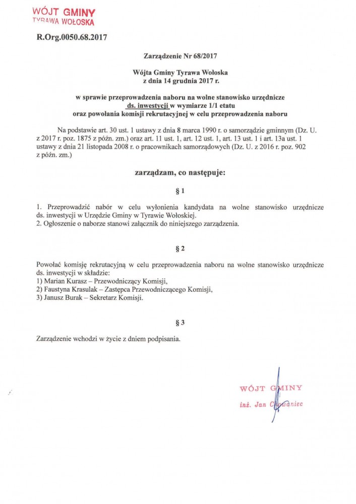 Ogłoszenie o naborze na stanowisko urzędnicze ds. inwestycji