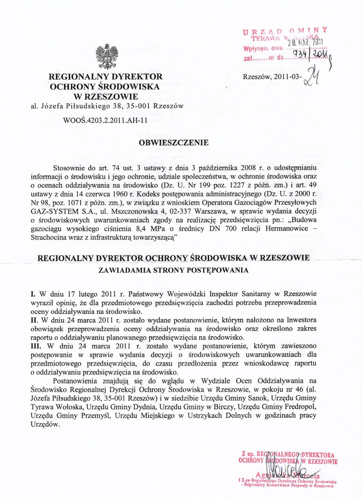 o przeprowadzeniu strategicznej oceny oddziaływania na środowisko projektu   zmiany Nr 1/2010 Studium Uwarunkowań i Kierunków Zagospodarowania Przestrzennego Gminy Tyrawa Wołoska  oraz projektu Miejscowego Planu zagospodarowania Przestrzennego,   dla Gazociągu Wysokiego Ciśnienia, relacji Hermanowice- Strachocina, terenu położonego w gminie  Tyrawa Wołoska