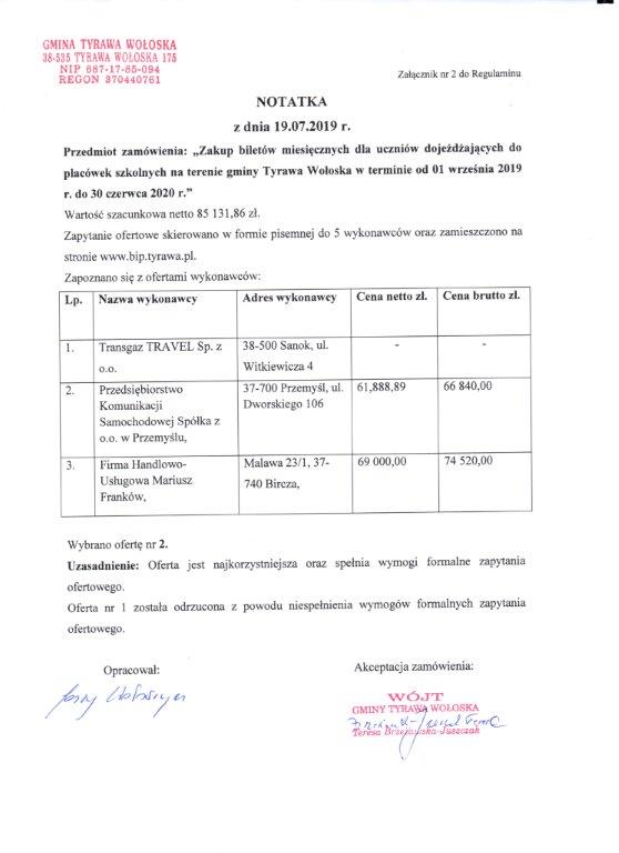 Przedmiotem zamówienia jest zakup biletów miesięcznych dla uczniów objętych obowiązkiem szkolnym i wychowaniem przedszkolnym placówek szkolnych na terenie gminy Tyrawa Wołoska w terminie od 01 września 2019 r. do 30 czerwca 2020 r. Zamówienie przewiduje przewóz dzieci (dowóz do szkół oraz odwóz do miejsca zamieszkania) w okresie wykonywania zlecenia w dni nauki.
